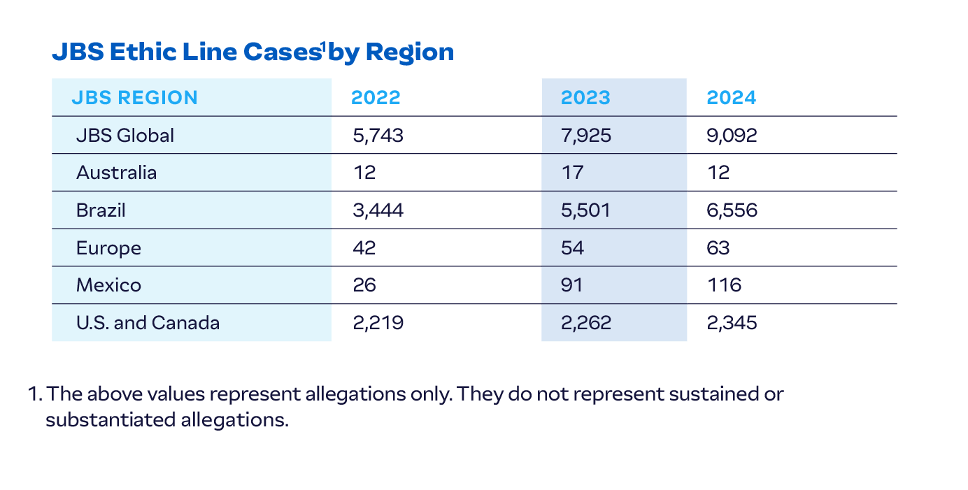 JBS is dedicated to fostering a culture of integrity by providing accessible, secure, and retaliation-free channels for reporting concerns. The JBS Ethics Line serves as a cornerstone of this commitment, offering team members and external stakeholders a 24/7 platform to report potential violations anonymously if they choose. Available in 18 languages across all operating countries and managed by an independent third-party provider, the Ethics Line protects confidentiality while addressing issues related to JBS policies, procedures, laws, and regulatory requirements.