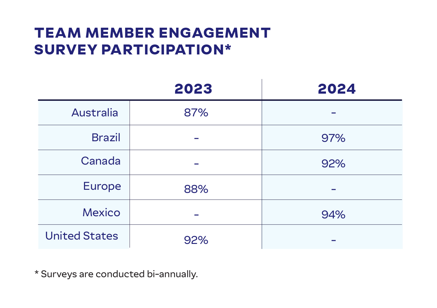 We are dedicated to attracting, retaining, and developing professionals who exemplify our values regardless of individual characteristics. To gain meaningful insights into team member attitudes and perceptions, we regularly conduct employee engagement surveys and use the feedback to inform continuous improvements to our policies and programs.