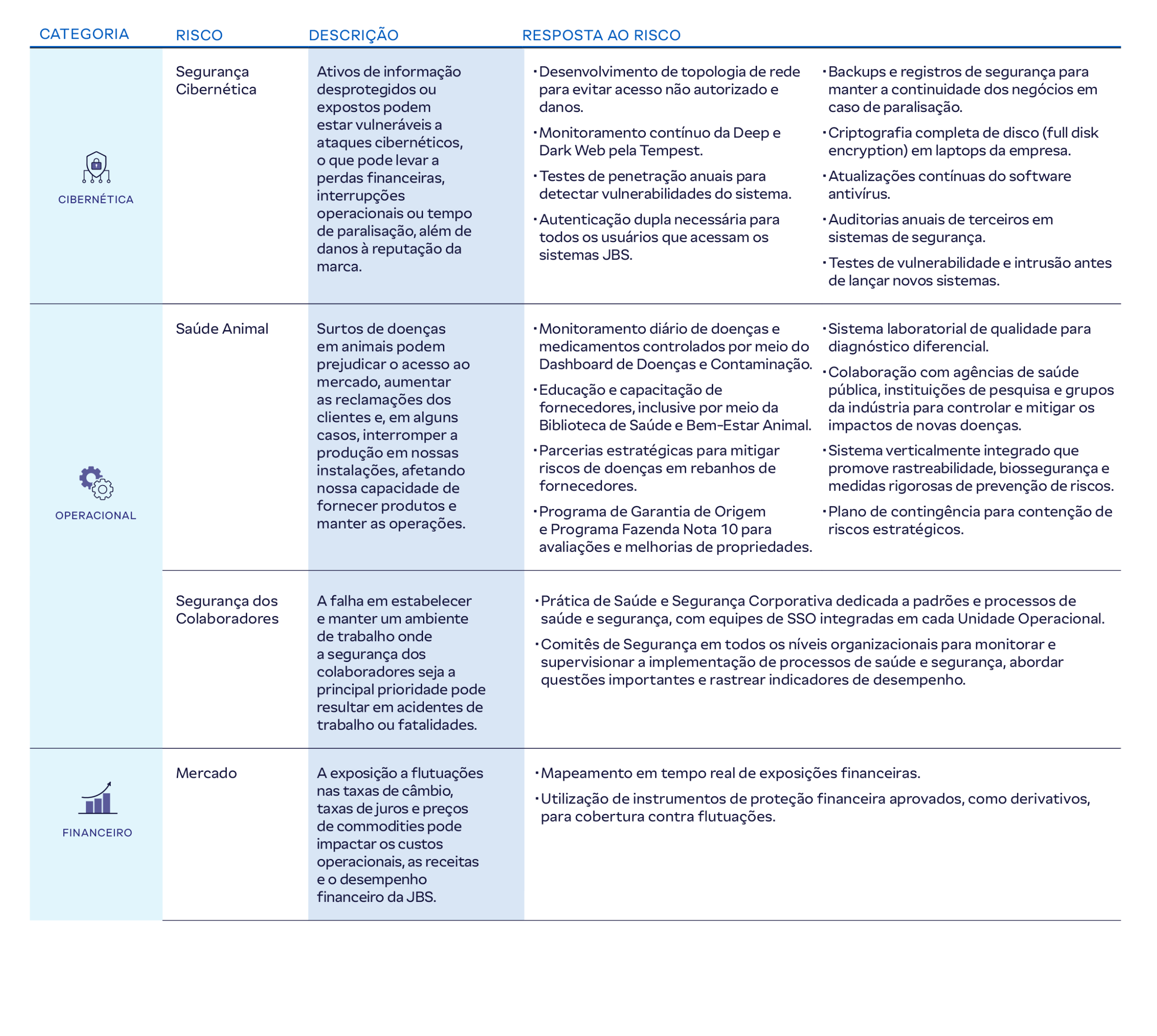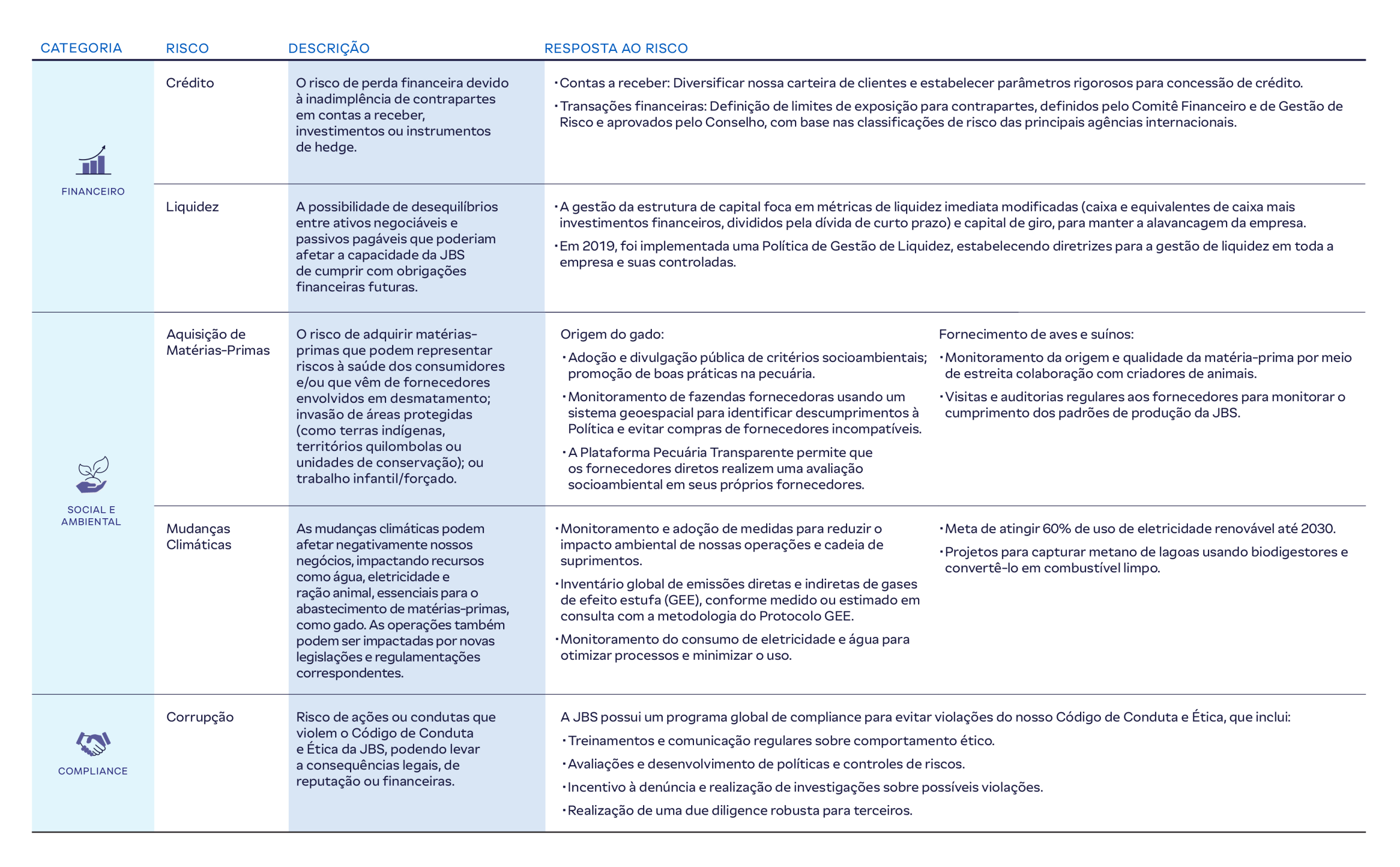 Na JBS, adotamos uma abordagem proativa à gestão de riscos em todos os níveis de nossas operações. Nossa equipe global de gerenciamento de riscos opera sob sua própria Diretoria de Riscos e Controle, que é responsável por detectar, monitorar, avaliar e mitigar riscos financeiros inerentes às nossas operações.